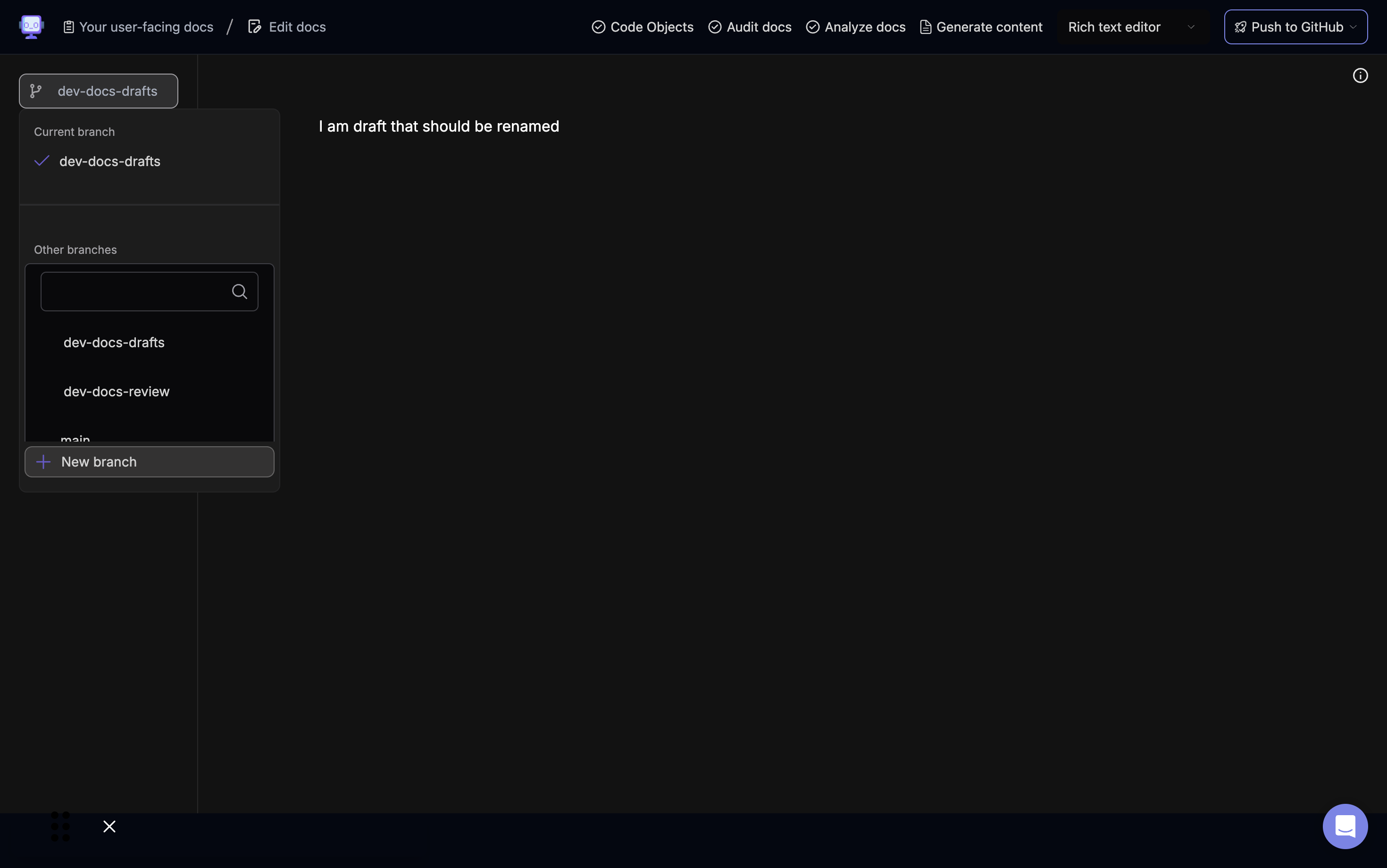 Step 1 Navigate to the branch menu in the left sidebar of your document editor. You'll see your current branch listed at the top.